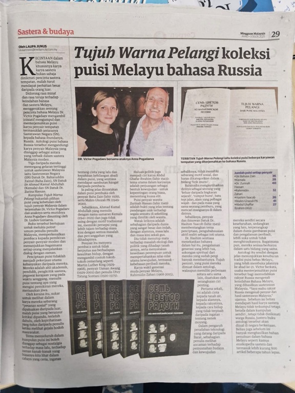 Опубликованный недавно московским издательством «Ключ -С» при поддержке Российского научно-аналитического портала “Восточная трибуна» сборник малайской поэзии «Семь цветов радуги» (Tujuh Warna Pelangi} вызвал большой интерес в Малайзии. Центральная газета на малайском языке «Utusan Malaysian” 3 августа с.г. поместила пространную статью, отметив, что книга (304 страницы, 230 стихотворений) в переводах Виктора Погадаева и его дочери Анны Погадаевой под редакцией ведущего научного сотрудника Института востоковедения РАН кандидата филологических наук Любови Горяевой является важной вехой в развитии культурных связей между Россией и Малайзией: теперь и российские читатели смогут познакомиться и насладиться всем богатством малайзийской поэзии. Семь поэтов, включая трех, носящих высшее звание Национального писателя (Баха Заин, Кемала, Зурина Хассан) как семь цветов радуги объединены в едином порыве, высоко вознося свою родину, народ, природу. Книга - не случайная подборка: она призвана нарисовать обобщенную картину малайзийской поэзии, познакомить читателя с кругом размышлений современных поэтов и показать, как каждый из них вел и ведет свой диалог со временем. Выражается также надежда, что издание переводов малайской литературы будет способствовать повышению интереса в России как к изучению малайской культуры и малайского языка, так и к Малайзии в целом.