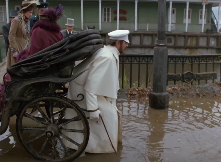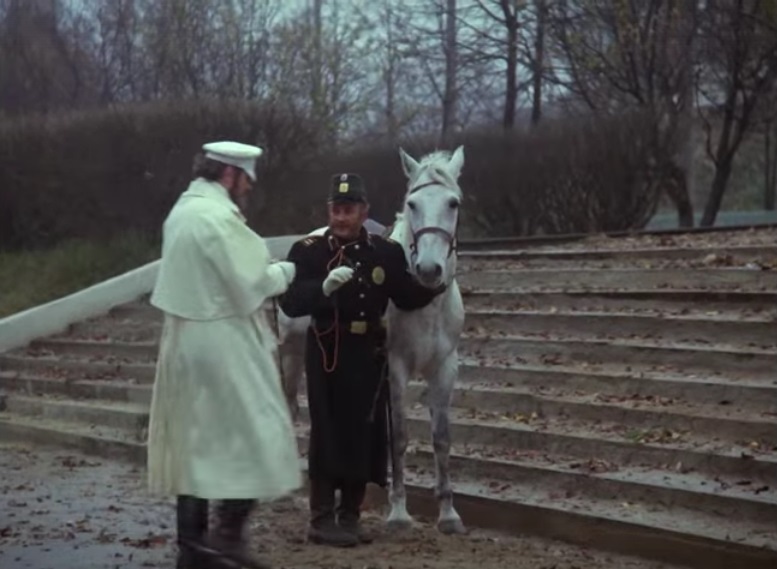 На этом кадре видно, что Паратов край плаща замочил, и тот потемнел даже больше, чем надо из-за предыдущих дублей съёмки. А через несколько секунд, рассчитываясь с жандармом за держание под уздцы коня, плащ уже сухой.