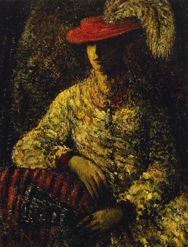 Соколов. Женский портрет. 1920-е годы. Я ж думаю, что нравление происходит не зря. И как бы оно ни было подсознательно, я, мол, смогу тайное самому себе разгадать так, что оно окажется логически поддержано всем тем, что я знаю об истории искусства. То есть я думаю, что роль подсознания в нравлении состоит в том, что – неведомо для моего сознания – устанавливается в мозгу соответствие деталей “текста” произведения с этими самыми моими же знаниями об истории искусства. Когда связь перечисленного замыкается, моё сознание ощущает: нравится. Плохо, что мне чаще всего надо читать у кого-то о понравившейся вещи (она почти всегда для меня бывает новинкой) и ждать, что из прочитанного годится для данной вещи. Именно эту вещь я, наоборот, принялся искать по интернету от чтения такого вкусного отрывка: "Такие его [М.К. Соколова] полотна, как “Битва”, портреты, “бульвары” — колористичны. Пригоршнями драгоценных камней разбросана краска. Она горит, играет в картине, пребывая в ней, однако, как нечто самостоятельное, вне органической, я бы сказал, вне детерменистически-логической связи с изобразительностью и сюжетом. Цвета приятные по сочетаниям, полноценные в самих себе, составляют как бы орнаментальное украшение, внешний покров картины, воспринимающейся как мозаика, инкрустация, шитье. Цветовая композиция такой картины по преимуществу декоративна. Кажется, что художнику безразлично, где и на чем, по выражению поэта, “рассыпать огненный стеклярус”. И вот его цвета загораются своими переливами на дамских платьях, как и на крупах лошадей, на копьях всадников так же, как в пейзажах с бульварами. Портрет отсутствует у Соколова-колориста. У него не изображения лиц, а туалеты, составленные из цветного бисера. Пусть не посетует на меня художник за сказанное. В утешение, если он нуждается в этом, я напомню, что портретам даже Рубенса и ван Дейка не однажды отказывали в портретности… …Техника Соколова в колористическом отношении стоит на большой высоте. Мастер обладает большим вкусом к цвету. Его работы доставляют изысканное удовольствие глазу. Они красивы в благородном смысле этого слова. Но ведь не цветом ограничивается живопись. Увлечение техникой само по себе не редко идет в ущерб глубине образа. Художники-формалисты склонны к аналитичности и впадают неизбежно в виртуозность, которая превращается в самоцель. Они начинают превозносить средства выше цели. Их интересует манера, а не жизнь.” (Тарабукин. Колористичность и живописность в работах Михаила Соколова. https://ojs.newartstudies.ru/index.php/journal/issue/view/18/newartstudies0123). Ну проверим, как этому золотому какому-то шитью всё равно, где блестеть. Например, едва ли не самая светлая точка помещена в тени под левой грудью дамы. Там бы тени уже господствовать. – Нет! Или вот. Источник света находится строго слева от лица (оно ровно пополам освещено.) Можно сказать, в плоскости лица, лишь чуть повёрнутого от нас влево. А то, что называется у руки плечом, оказывается ближе к нам, чем та плоскость с источником света. То есть источник света ЗА этим так называемым плечом. Но тогда на нём должна быть тень. А её нету. – Соколову жалко уменьшить площадь сияния. По той же причине нет тени на цилиндре шляпы. Она сияет ядовито-красным, и жаль уменьшать это сияние.