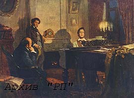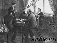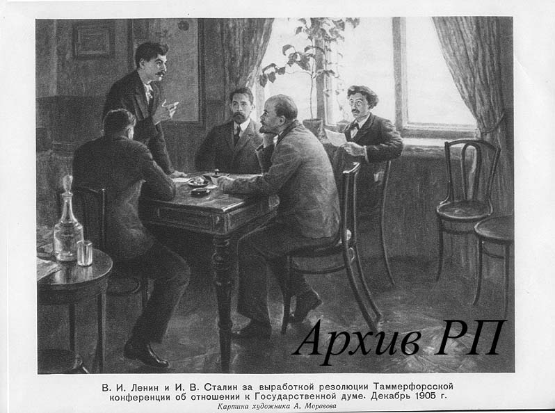 В.И.Ленин и И.В.Сталин за выраьоткой резолюции Таммерфорсской конференции об отношении к Государственной думе. Декабрь 1905 г. Картина худ. А.Моравова.