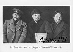 В.И.Ленин, И.В.Сталин и М.И.Калинин на VII съезде РКП(б). Март 1919 (фото) (последовательность в подписи воспроизводится по изданию)