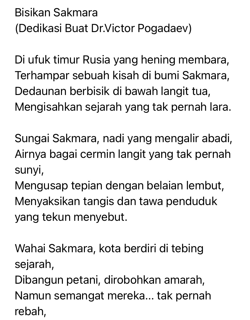 Недавно я получил письмо из Малайзии от одного знакомого поэтаПандиан В. (PandianV.), которыйприслал посвящённое мне стихотворение «Шёпот Сакмары» (BisikanSakmara). Пандиан В. – не только известный поэт, но и один из руководителей литературного объединения Pemuisi (Поэт), в одноимённом ежемесячном журнале которого были опубликованы переводы российских поэтовНаталии Ленской (2019), Игоря Сида (2020), Нины Габриэлян (2020), Надежды Акисовой (2020),Зульфии Усмановой (2021), Вадима Терёёина (2023). Во время своих поездок в Малайзию я неоднократно встречался с руководством этой организации, включая Пандиана В., и рассказывал им о своих родных местах. Это, видимо, и вдохновило малайзийского поэта на написание стихотворения. Стихотворение написано верлибром, и я сохранил эту форму в переводе.