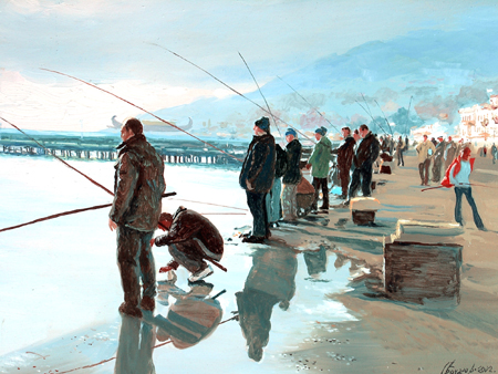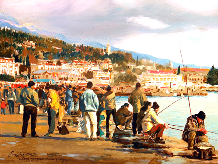 В основном, это пейзажи, но особо выделяется серия, которую художник объединил под общим названием - <Кушать хочется>. На картинах мы видим прекрасные виды в районе Ялты весенним утром, которым контрастирует безрадостная рыбная ловля с берега. Рыбалка здесь - в первую очередь, для добычи пропитания.