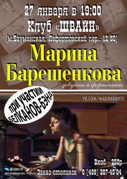 27 января в клубе <Schwein> пройдет совместная концертная презентация альбомов <Дальше> Марины Барешенковой (лейбл <Отделение ВлХОД>) и <Нейтралитет> Владимира Белканова (лейбл <Выргород>). Марина Барешенкова, работающая в редком жанре фортепианной авторской песни, выступит сольно, под цифровое пианино Kurzweil, а актюбинский панк-бард Владимир Белканов - в сопровождении своего состава <Белканов Бэнд>.