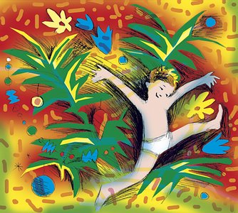 раздевается до трусов. Потом снимает с пальмы елочные бусы и себе на