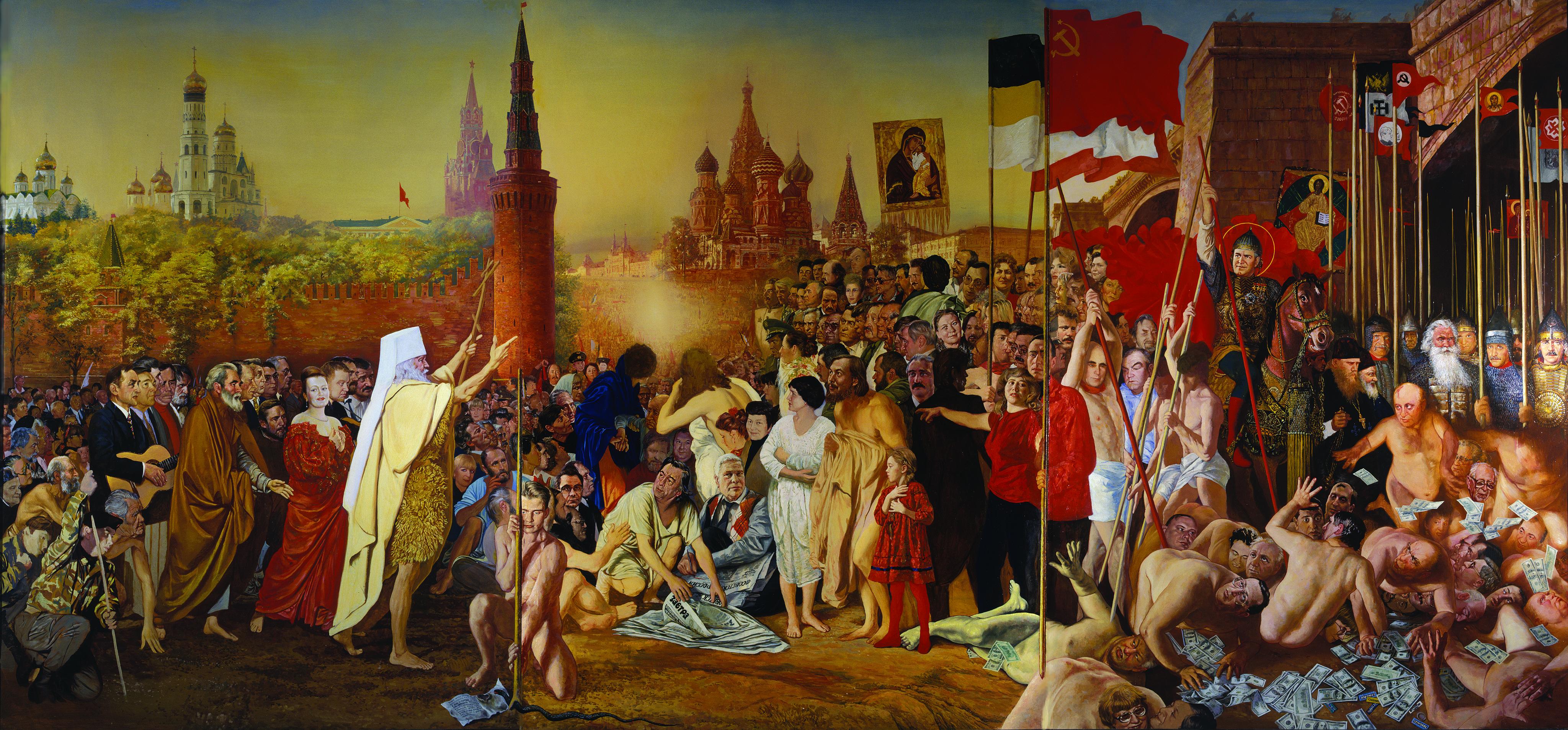 - Сегодня обнаружил в правом углу картины Сергея Бочарова "Явление Народа" среди стервятников нашей страны в то далёкое смутное время Е.Боннер, Старовойтову, Лужкова, Филатова,Сванидзэ... А ведь это был 1999 год!