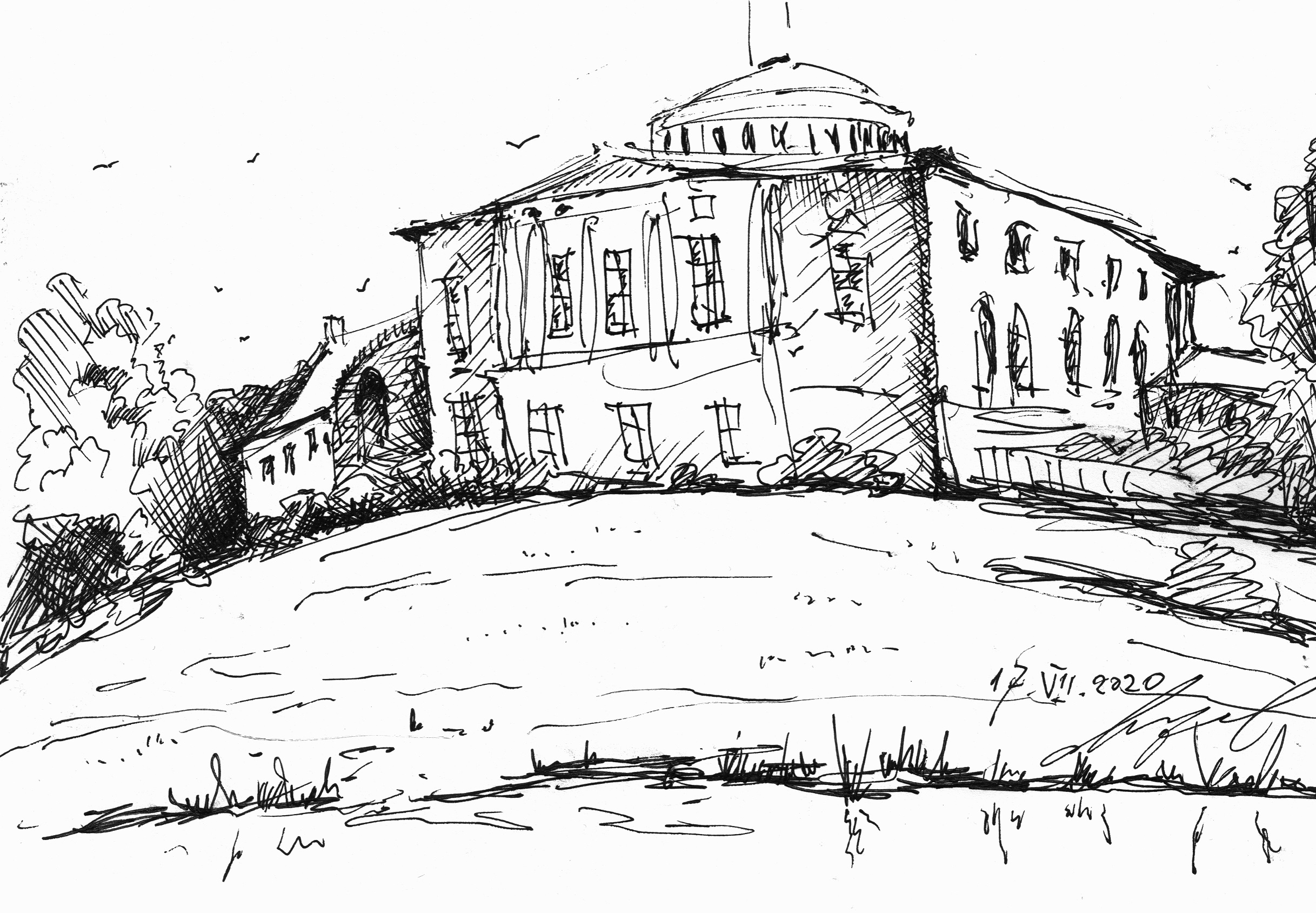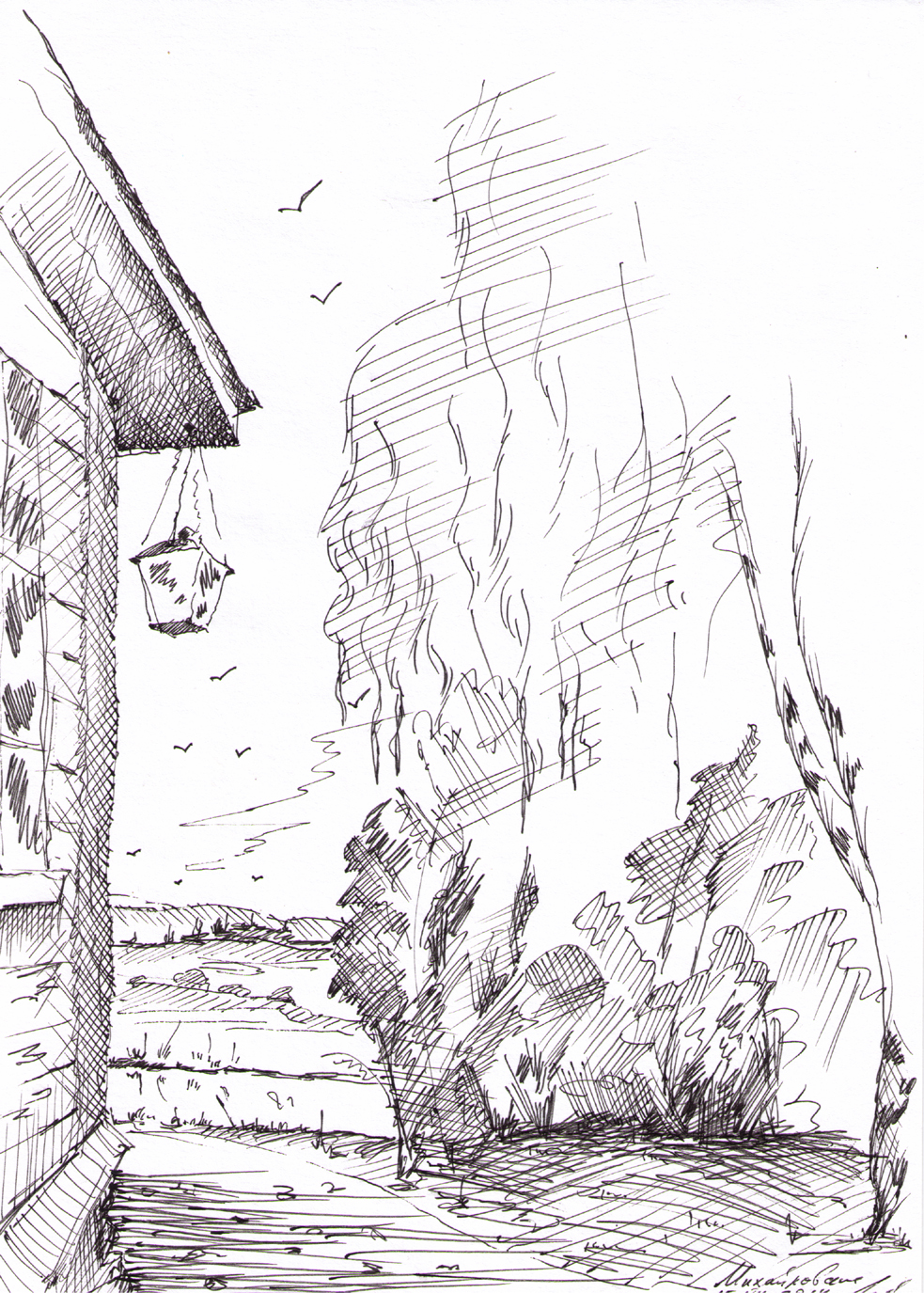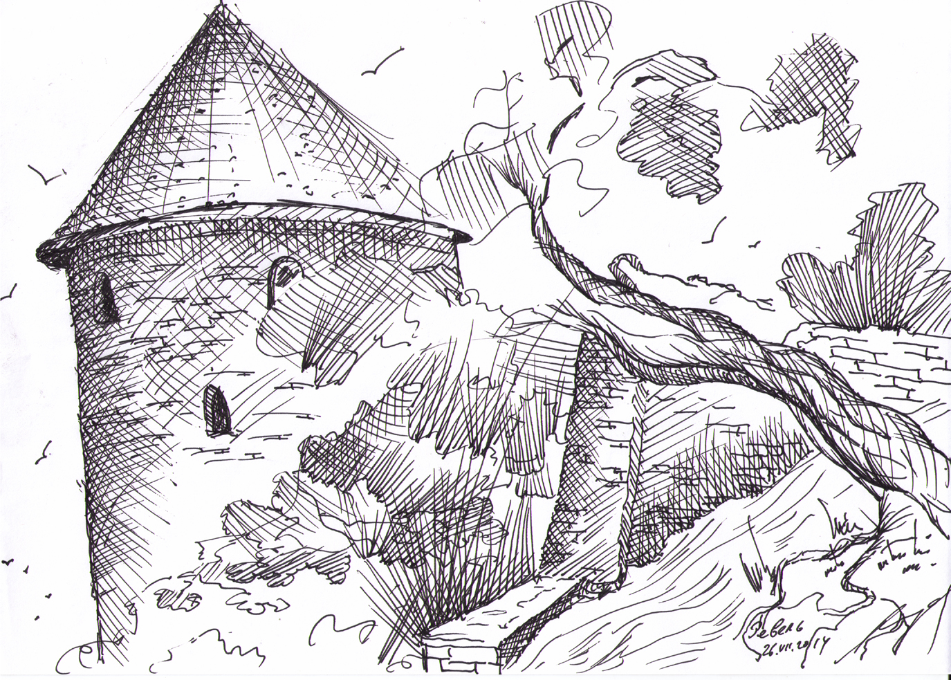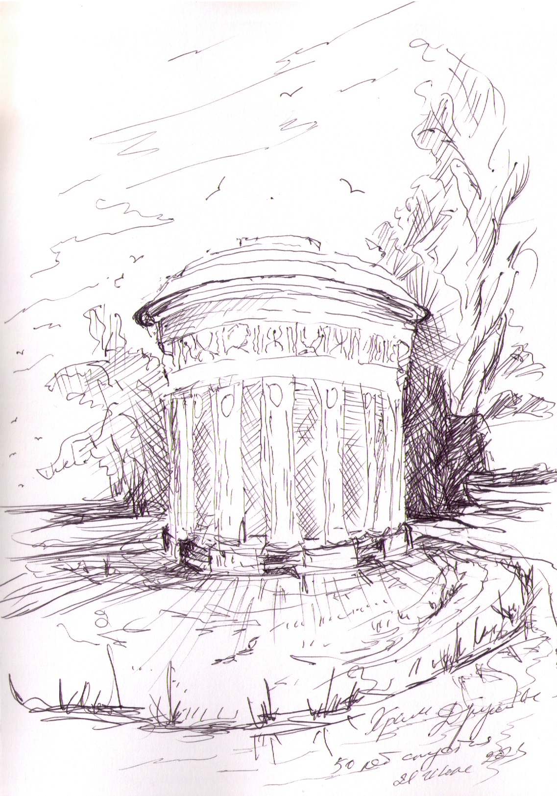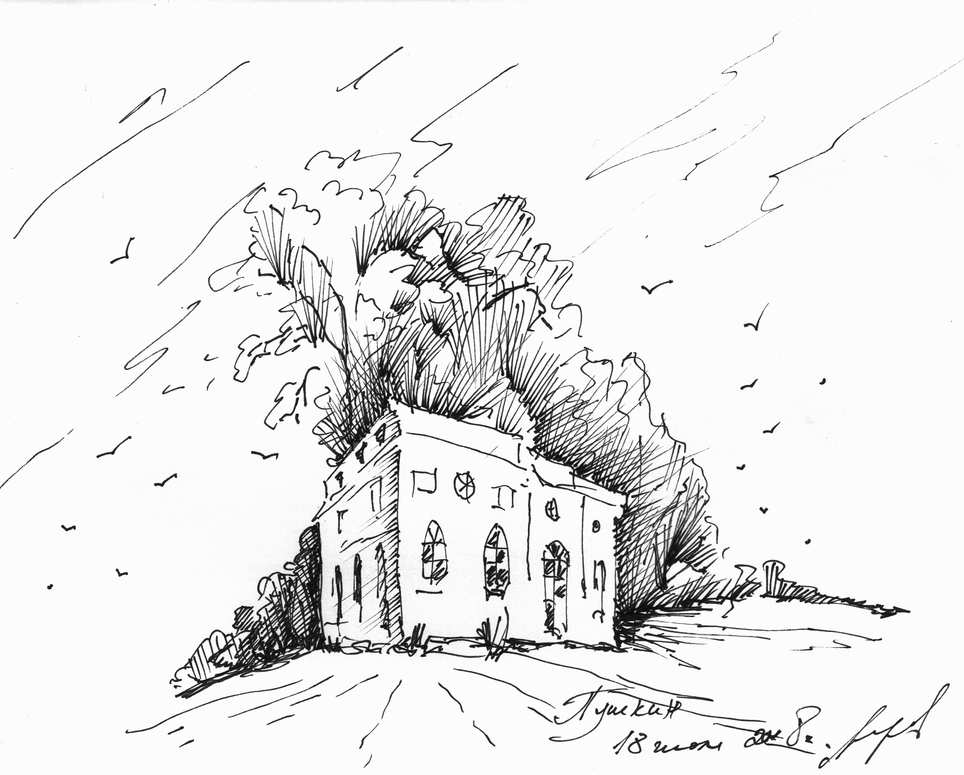 Кирха под берёзами на развалинах храма Святовита. Рисунок автора. Конечно нет там никакого коловорота - я его разместил чтобы придать изначальный смысл данному месту. Июль, 2019г.("Путешествие на остров Буян") |