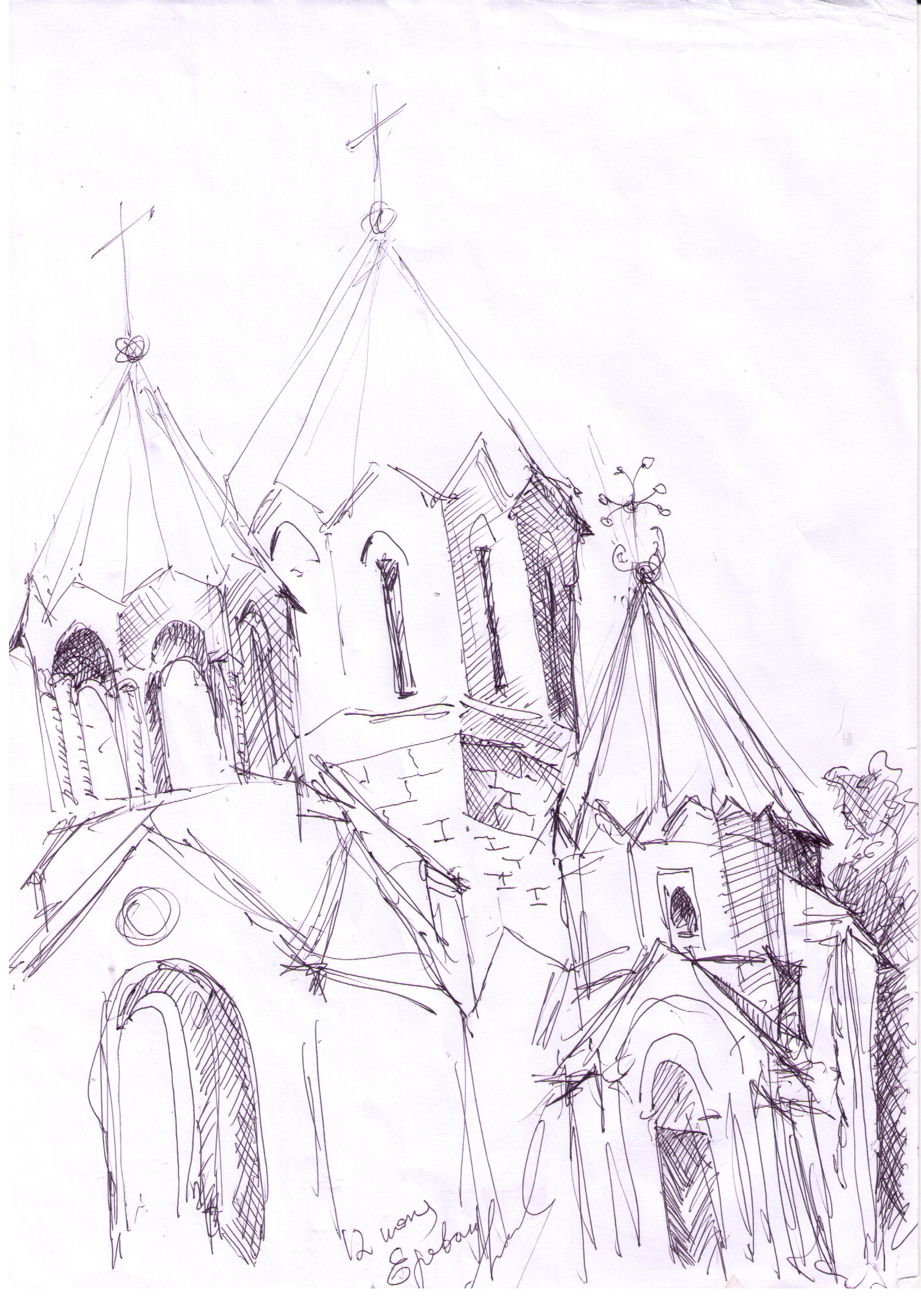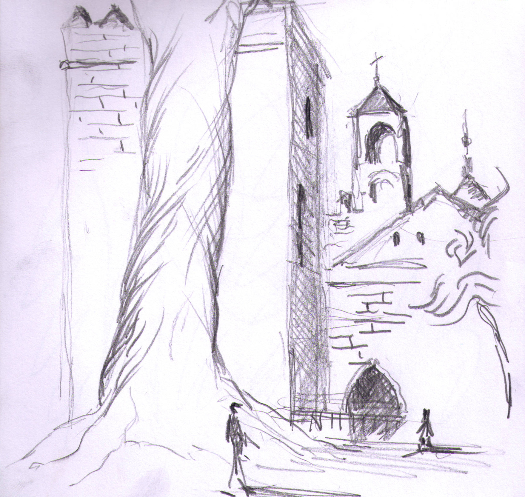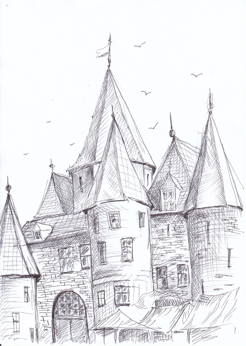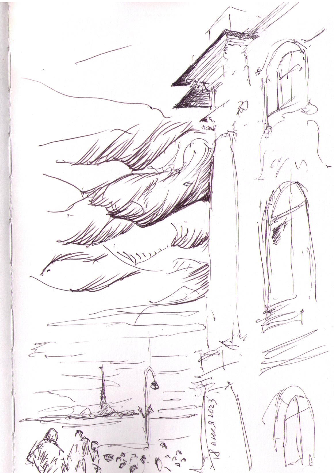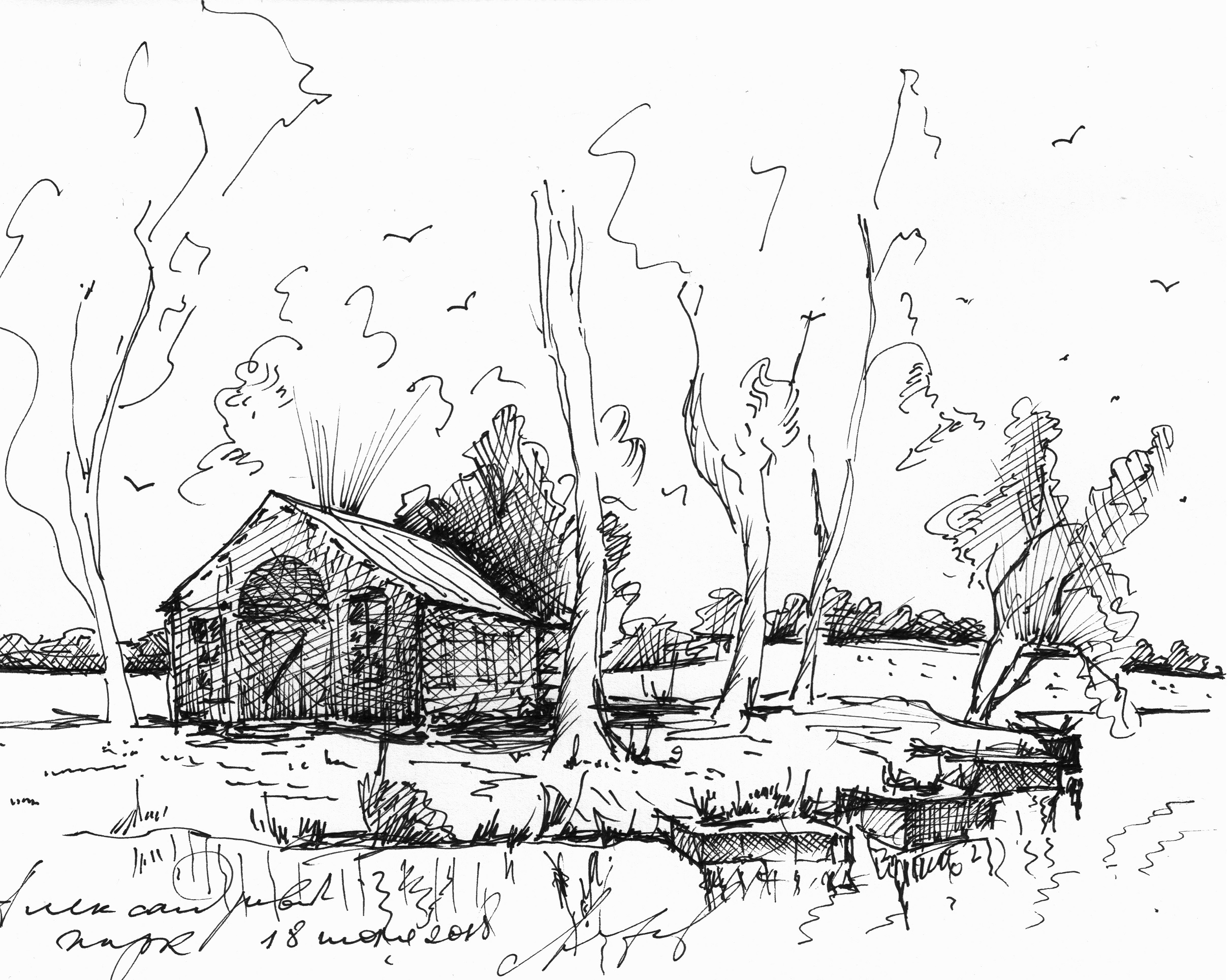 Кирха под берёзами на развалинах храма Святовита. Рисунок автора. Конечно нет там никакого коловорота - я его разместил чтобы придать изначальный смысл данному месту. Июль, 2019г.("Путешествие на остров Буян") |