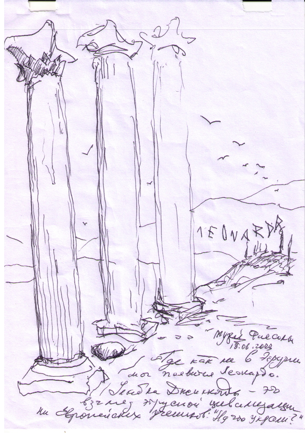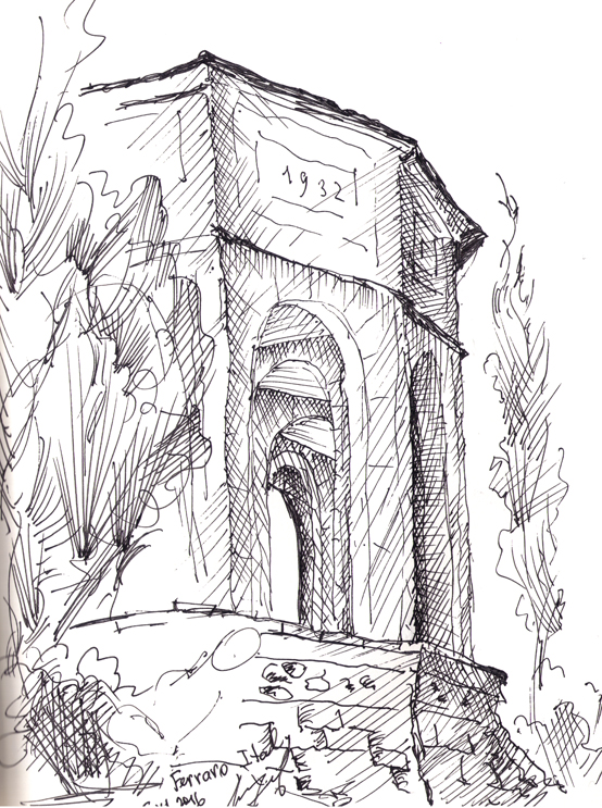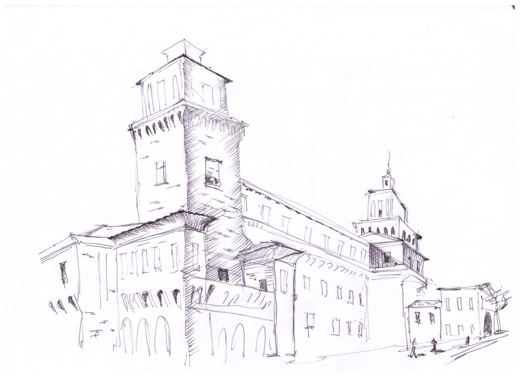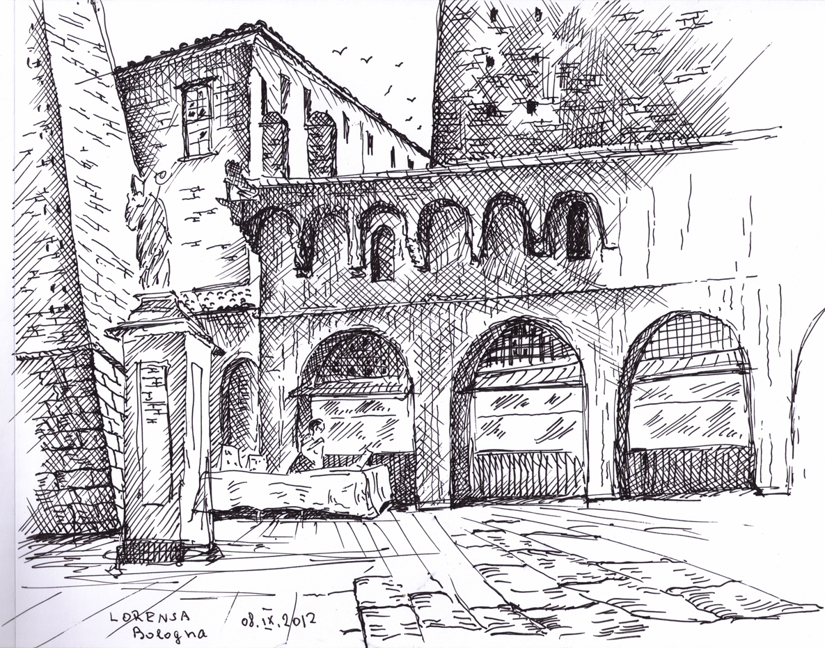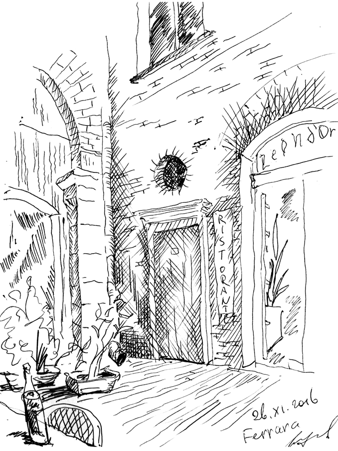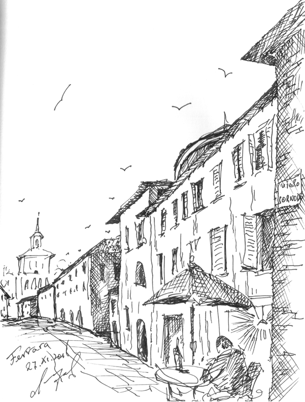 "Узники науки". Дворик библиотеки университета г. Феррара. Библиотеку устроили в здании бывшего сахарного завода. Рисунок подарен Льву Титарчуку - ученому, другу и человеку - который провел здесь не один год. Надо иметь в виду, что университет г. Феррара заканчивал Николай Коперник. Ноябрь. 2016. Италия. |