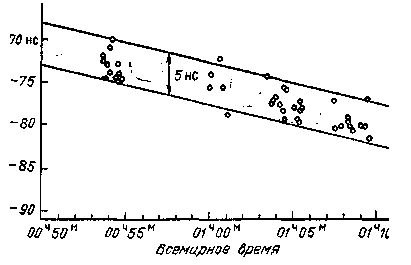 Каждый сигнал показан кружком. Их разброс, как видно из графика, не превышает 5 нс. Зато четко прослеживается рост разности моментов с временем, из которого следует, что движение Луны слегка отличается от теоретического, так что разность положений Луны (наблюденного и эфемеридного) возрастает на 4,5 метра за час.