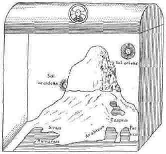 Вселенная Космы Индикоплова -- несложный механизм. Земля имеет форму прямоугольника, длина которого между востоком и западом вдвое больше ширины -- между севером и югом. Сверху прямоугольник Земли возвышается в гору, верхушка которой наклонена к северо-западу, и по склону этой земли-горы от севера до юга живут разные народы. Между прочим, на севере живут гипербореи, а несколько южнее "великая русь". Восточные страны находятся у подошвы земли-горы; солнце, шествуя в своем дневном пути вокруг земли-горы и склоняясь к югу, проходит ближе к южным, нежели к северным странам; поэтому первые "зело согреваеми суть". Северные же и западные страны, расположенные на верхушке земли-горы, "далече от солнца стояще, студена суть, тем и телеса тамо живущих бела суть от студени". По той же причине --"не вся земля живо-ма есть; северные убо части до конца студены неживома есть, и полуденные страны от зельные теплоты неживома остала".