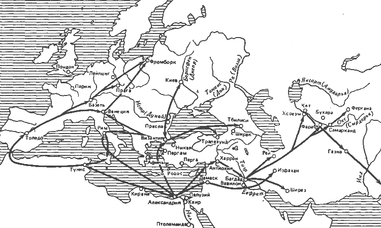 Однако все перечисленные нами направления "миграции" "Альмагеста" и других сочинений Птолемея (или отрывков из них) -- это не главные пути. Основной путь, который и привел в конце концов к широкому распространению "Альмагеста" по странам мусульманского Востока, а затем к проникновению его в Европу, лежал через Багдад.