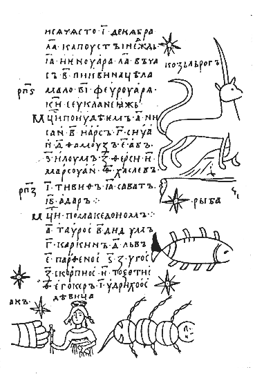 великого князя Святослава Ярославича -- замечательный памятник культуры Киевской Руси [69]. В "Изборнике", кроме перевода отрывка из Иоанна Дамаскина, можно найти изображения всех 12 знаков зодиака (рис. 35), заимствованные из того же источника [40]. Так мировоззрение Птолемея проникло и на Русь -- гораздо раньше, чем в Западную Европу.