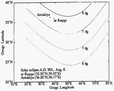 3. Solar eclipse A.D. 901, Jan 23. (ar-Raqqa): The time of true conjunction was 21:19:29 p.m. mean local time. The Sun was in Aquarius 8°7'. From al-Battam's E.q.T., we derive for this solar position: 0°14'46"; or 00:00:59 in time units. The local true time of the true conjunction was then 21:20:28 p.m. (equinoctial hours). The apparent conjunction was, as stated by al-Battam, 50 min before the time of the true conjunction, that is 20:30:28 p.m. The time is counted from the noon of the previous day of observation; this means 03:29:32 before the actual noon. In perfect agreement with the time given by al-Battam: "less than 31/2 hours [equinoctial hours] before noon". In Figure 1, we have plotted the eclipse path with lines of equal magnitude. The diagram was calculated using DT = 0 s. The plotted magnitudes are digits of the diameter. The observed magnitude in Antakiya was little more than the half part of the Sun. In ar-Raqqa, the magnitude was " in the appearance" less than 2/3. From Figure 1, we can see that the difference of the observed magnitudes is, for any value of DT, not so high as the records insinuate [the varying of DT means that one has to shift the eclipse path eastwards in longitude with DT = Dl/1.002738 s]. According to Ptolemy, the eclipse should have been total.