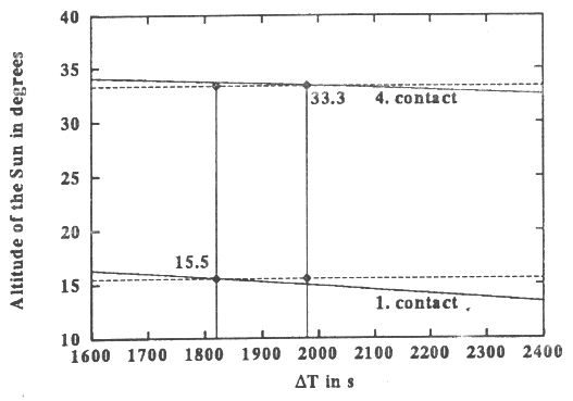 Stephenson and Said (1989), without a plausible justification, put the altitude of the Sun at exactly 15.°5 for the first geometrical contact (The first geometrical contact is the moment when the two luminaries are tangential to each other; thus, at this moment the Sun is by no means eclipsed). Further, they put the 4. geometrical contact at exactly 33.°3 [Newton's procedure is nearly the same. (Newton, 1984), p. 114]. They then deduce DT(l.contact) = 1820 s and DT(4.contact) = 1980 s and give to both values the same statistical weight of 1.0 in a least square fit with a parabola. Beyond the fact that it does not make sense to interpret the observed parameters in that manner, they introduce a systematic error by doing this. As one can see from Figure 2, the first and the fourth contact are not statistically independent quantities. DT is always the same for all circumstances of a particular eclipse, and this fact can be used to weight and determine a lower limit of error for the particular eclipse.