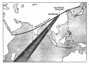 TOTAL SOLAR ECLIPSE was noted by the court astronomers at Ch'ang-an (modern Slan), then the capital of China's Western Han dynasty, on March 4, 181. b.c. This observation te evidence that the earth's speed of rotation Is gradually diminishing. Unless allowance is made for the resulting increase in the length of the day, a plot ot this totality track would not pass over Ch'ang-an, as the Chinese historical records prove it did. Both the conical shape of the moon's shadow in space and the shadow's elliptical shape on the earth's surface are exaggerated.