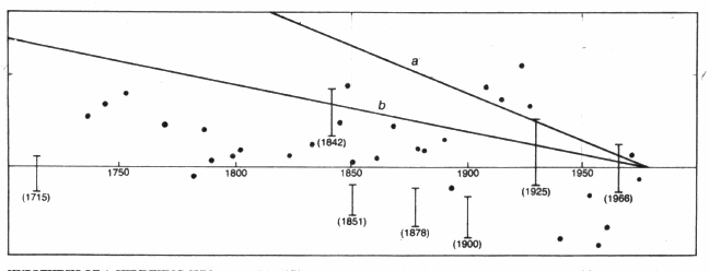 As these various examples, drawn from records over the past 2,500 years, make clear, there is a rich store of both solar and lunar eclipse observations that can be utilized in the study of the earth's rotational history. Nevertheless, these data are far from ideal. For instance, there is a gap between a.d. 100 and 800 and little usable material between a.d. 1300 and 1600. Hence it is not at present possible to trace a continuous history of the variations in the rate of the earth's rotation. How much can be done?
