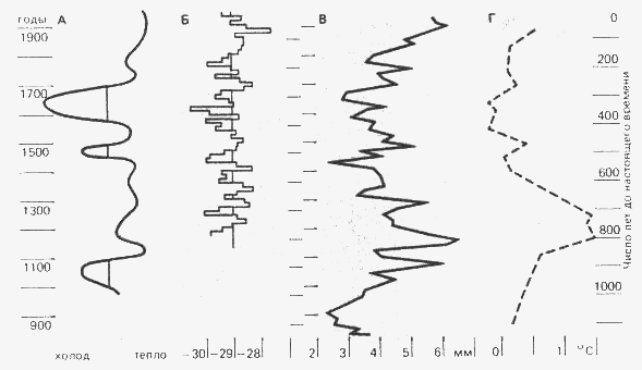 Наиболее теплый период во время малого климатического оптимума в Северной Америке, на европейской части страны, в Гренландии приходится, по-видимому, на 950-1200 гг. н. э. В Европе наиболее теплый период отмечался между 1150-1300 гг. Общее представление о климате последнего тысячелетия дает рис. 8.