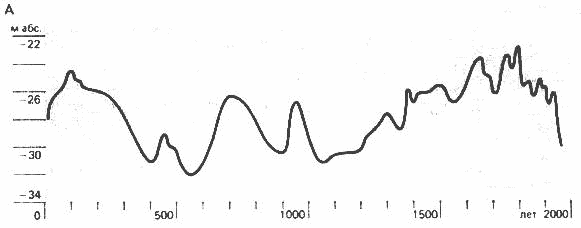 Рис.9. Изменение уровня Каспийского моря за последние 2000 лет.