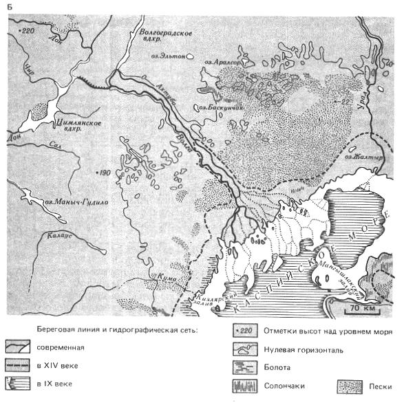 Б - Изменение береговой линии Каспийского моря и устья Волги с IX столетия по настоящее время.