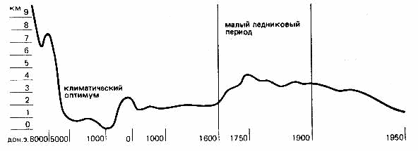 Колебания климата за последние несколько тысяч лет очень хорошо характеризуют состояние ледников. На рис. 10 приведены данные о колебаниях толщины ледников в Исландии и Hopвегии за последние 10 тыс. лет.