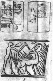 Живую иллюстрацию этому дает недавнее сенсационное открытие румынского археолога Н. Влассы. Раскапывая неолитическое поселение Тэртэрия, он нашел под неолитическим слоем целый комплекс импортных южных предметов, в том числе глиняные таблички с письменностью и изображениями, очень близкими месопотаыским (рис. 17).