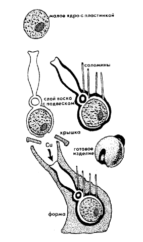 При производстве предметов более сложной конфигурации древние литейщики использовали технику литья с потерей литейной формы. Восковую модель они обмазывали глиной. При обжиге глины воск вытекал, и его потом замещала бронза. Однако, вынимая бронзовую отливку, формы приходилось разбивать, так что рассчитывать на ее вторичное использование не приходилось. Экспериментаторы отрабатывали этот метод, исходя из технологической инструкции XVI века по изготовлению золотых и серебряных бубенчиков. Во время опытов они заменили золото медью, чтобы одновременно проверить возможность замены драгоценных металлов обычными. Температура плавления золота равна 1063oС, меди --1083oС. В качестве образца была выбрана отливка медного бубенчика из стоянки первого тысячелетия до н. э. Форму изготовили из смеси глины и древесного угля, а модель -- из пчелиного воска. Малое ядро сделали из смеси глины и молотого древесного угля и поместили в него маленький камешек -- сердце бубенчика. Воск нанесли вокруг ядра тонким слоем, равным толщине стенки будущей отливки, и прилепили восковое кольцо, образующее подвесок будущего бубенца. Восковую бобышку в форме рукоятки прикрепили над кольцом таким образом, чтобы она служила бункером для расплавленного металла во время разливки, затвердевания и усадки металла в отливке. В восковой оболочке на нижней части бубенца вырезали отверстие, чтобы формооб-разующая смесь из глины, древесного угля и воска заполнила отверстие и зафиксировала положение ядра после выплавки восковой модели и во время литья. Обернутую форму в верхней части проткнули несколькими соломинами, которые позже либо сгорели, либо просто были удалены. Через возникшие отверстия из формы во время литья выходил горячий воздух. Всю модель покрыли несколькими слоями размолотой глины и древесного угля и в течение двух дней сушили. Потом ее еще раз покрыли слоем угля и глины (для прочности формы) и над бобышкой прикрепили воронкообразный заливочный бункер из той же формообразующей смеси. Бобышку прикрепили слегка наискось, чтобы форма отливалась в наклонном состоянии. Это должно было обеспечить беспрепятственное стекание расплавленного металла по нижней части ее лицевой стороны, в то время как по противоположной стороне должен был происходить отток вытесняемого металлом воздуха до полного наполнения всей формы расплавленным металлом. Перед плавкой в бункер, закрытый крышкой, бросили обломки медной руды. После сушки форму поместили в печь, оборудованную каналом, обеспечивающим тягу. Печь заполнили четырьмя с половиной килограммами древесного угля и разогрели до температуры 1200oС. Восковая модель и восковая бобышка расплавились и выпарились, медь расплавилась и стекла в форму, где и образовала металлический бубенчик. Потом внешнюю рубашку разбили, металлическую бобышку удалили, а глиняное ядро, образовавшее полую часть бубенца, выковыряли -- остался только камешек.