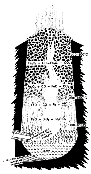 Восстановление железа начинается уже приблизительно при температуре 500 °С. Вы, вероятно, сейчас зададите вопрос, почему железо стало применяться на столетия или тысячелетия позже меди и бронзы. Это объясняется условиями его тогдашнего производства. При тех температурах, которые достигались первыми металлургами в их горнах и печах (около 1100oС), железо никогда не переходило в жидкое состояние (для этого необходимо хотя бы 1500oС), а скапливалось в виде тестообразной массы, которая в благоприятных условиях сваривалась в крицу, пропитанную шлаком и остатками горючих материалов. При такой технологии в железо из древесного угля переходило ничтожно малое количество углерода -- около одного процента, поэтому оно было мягким и поддающимся ковке даже в холодном состоянии. Изделия из такого железа не достигали твердости бронзы. Острия легко загибались и быстро зату-