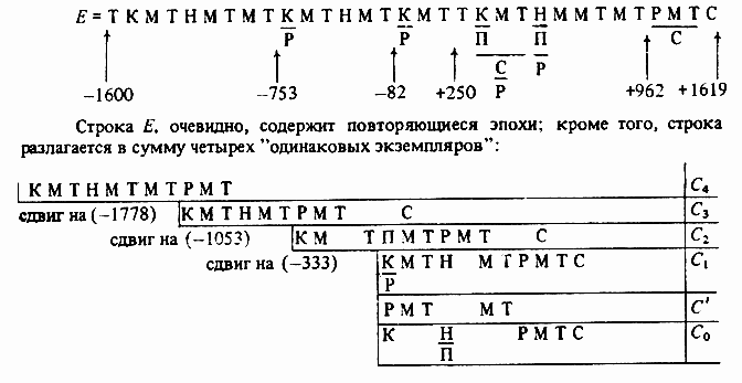 Здесь Е = C1+ С2+ С3+ С4, C1 = С0 + С'. Итак, все 4 строки C1, С2, С3, С4 практически одинаковы и для получения всей длинной строки-учебника Е достаточно склеить их друг с другом (по вертикали). Строка С2 приклеивается к строке С1 со сдвигом на 333 года, С3 -- к С1+ С2 со сдвигом на 1053 года, C4 к C1+ С2+ С3 со сдвигом на 1778 лет. Все эти результаты полностью согласуются с хронологическими выводами, полученными в [4].