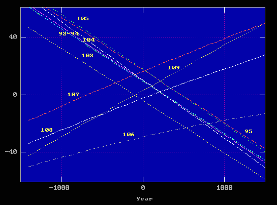 Для каждой из придуманных ранее зон КНФ рассчитывают регрессионнными методами амплитуды и фазы синусоид g(t)и f(t). Я повторил все расчеты и у меня есть существенные замечания, как по процедуре отбрасывания звезд, так и по оценке погрешностей оценивания, но я не буду подробно на этом останавливаться, поскольку, как оказывается, эти данные в последующем никак для датировки не используются. Стоит заметить, что параметры систематических ошибок для всех областей оказались близки и перекрываются в пределах погрешностей их оценивания [4, Рис. 6.3-6.9]. Особенно близки ошибки для хорошо измеренных звезд северного полушария - зачем же тогда были все игры с делениями на зоны? Это видно и из [4, Таблица 6.2], если исправить в ней опечатку, заменив плюс на минус для f в первой колонке. Очень четко надуманность деления проявляется при анализе КНФ каталога Тихо Браге. Остается только восхищаться аккуратности и дотошности дотелескопических наблюдений этого астронома. Мне стало просто обидно за него, когда я прочитал "Поэтому, несмотря на многочисленные усовершенствования и высокую точность изготовления своих приборов, Тихо добился точности измерения, сравнимой по порядку, с точностью "Альмагеста" (2'-3' вместо 10'-15' [точнее сказать 15'-25' М.Г.])" [4, стр 193]. Такое может написать лишь тот, кто абсолютно ничего не понимает в технике измерений. Чтобы понять достижение Браге, представьте, что у Вас во столько же раз возросли денежные доходы, во сколько у него возросла точность измерений. Это принижение понятно, ведь хочется доказать, что каталоги разделяет всего лет сто. (В последних книгах авторы "новой хронологии" дописались уже до отождествления Тихо Браге с Гиппархом. Видимо они полагают, что в обсерватории Ураниборг на острове Вен, которая съедала ощутимую часть бюджета датского королевства, была машина времени. Только так можно объяснить странное желание Браге (1546-1604) читать о своих достижениях под псевдонимом Гиппарх в трех сохранившихся экземплярах Альмагеста из библиотеки обсерватории, на одном из которых, изданном в Базеле в 1551 году рукой Браге - еще студента надписано за какую цену и когда он его купил.) И гистограммы ошибок, и все рассчитанные КНФ кривые систематических ошибок (порядка 1' !) для разных зон у Тихо практически совпадают [4, стр 195-200]. Точнее сказать, графики f(t) для зон восточного полушария отличаются только знаком от графиков для зон западного полушария, мне кажется здесь виноват не Тихо а КНФ, поскольку, почему-то, у них фаза f(t) скачет при переходе через 90 или -90 градусов, хотя она должна меняться в диапазоне от 0 до 360 или от-180 до -180 градусов.