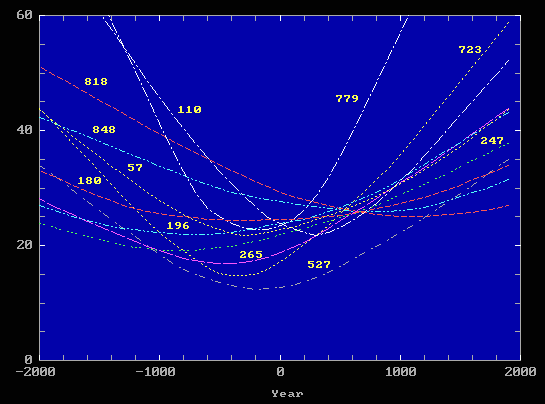 от 700 г. до н.э. до 800 г.н.э.; A=780 на промежутке от 900 г.н.э. до настоящего