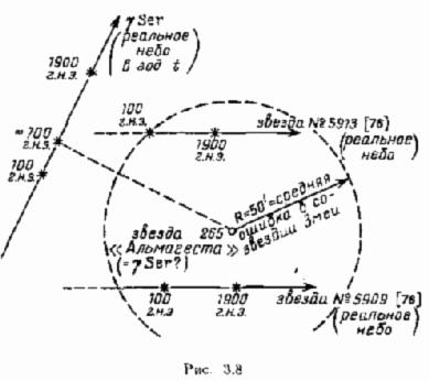 В этой же главе (с.80-84) КНФ пытаются обосновать свой отказ от рассмотрения долгот. При этом авторы ссылаются на несколько скандальную книгу Р.Ньютона [8]: "Долготы не являются результатом никакого наблюдательного процесса ... Значения долгот сфабрикованы ... [33, с.249]". Такой способ цитирования весьма далек от научных норм, на самом деле Р.Ньютон утверждает, что приняв неверную скорость прецессии 1 градус в сто лет (вместо 1.39), Птолемей позаимствовал звездный каталог Гиппарха созданный на 265 лет раньше, добавив 1*2.65=2o40' ко всем долготам. Это позволяет объяснить как странное распределение дробей в значении долгот (именно это имеет в виду Р.Ньютон, утверждая, что долготы в том виде, как они приведены в Альмагесте не являются результатом наблюдений и "значения долгот сфабрикованы только что описанным способом"), так и отличие долгот в среднем на 1 градус 2.65*(1.39-1.00)=1.03. "Распределение дробных частей градуса в долготах вместе со смещением по долготе убедительно показывает, что долготы получены прибавлением 2o40' к некоторому множеству долгот, измеренных за 2 2/3 века до эпохи каталога Птолемея." [8, с.253]. На самом деле существуют и альтернативные объяснения: 1 градус - это как раз ошибка в долготе солнечной теории Птолемея, а ведь именно по Солнцу определял Птолемей долготы опорных звезд, а необычное распределение долгот могло получиться после прибавления долгот опорных звезд, ведь долготы Спики, Альдебарана и Антареса как раз оканчиваются на 2/3=40'. Обсуждение всех за и против версии плагиата Птолемея заинтересованный читатель найдет в работах [9,10,11]. Кстати спор этот имеет очень давнюю историю и, как мы видели, восходит еще к трудам арабских астрономов и к основательным исследованиям Деламбра. Довольно странно, что приступая к написанию книги в хорошо исследованной области, КНФ не взяли на себя труд ознакомиться хотя бы с малой частью весьма многочисленных современных работ, посвященных Альмагесту и его звездного каталога - это позволило бы им избежать многих ошибок.
