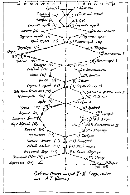 Из династических потоков Империй II и III Фоменко выделил две струи длины 15, для которых ВНД оказался равным 1.3*10-12. Это значение ВНД означает практически полное совпадение двух струй, осуществляющееся, подчеркнем, по 15 статистически независимым позициям. Так как полная длина обоих потоков равна 36 (см. рис.), то можно вычислить еще 15 значений для ВНД (смещая первую точку отсчета). Оказывается, что все эти 15 значений ВНД имеют порядок 10-25. Струя (длиной 36) из Империи II практически полностью исчерпывает всю эту империю; струя же из Империи III во всяком случае содержит всех знаменитых императоров. Впервые такого рода струи были обнаружены Морозовым, который заподозрил их существование на основе своих общетеоретических конструкций. Поскольку Морозов искал параллельные струи простым подбором и не владел обшей методикой, найденные им струи в деталях отличны от оптимальных струй Фоменко.