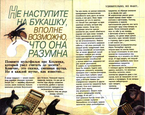 Наконец, совсем недавно фурор среди этологов -- ученых, занимающихся исследованием поведения животных, -- произвели доктор биологических наук Ж.Резникова из Института систематики и биологии животных Сибирского отделения РАН и доктор технических наук Б.Рябко из Сибирской госакадемии телекоммуникаций. Новосибирские ученые выяснили, что выполнять простейшие арифметические операции -- складывать и вычитать небольшие числа -- умеют даже муравьи!