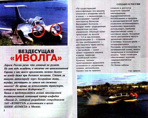 Таким и представляется легкий многоцелевой десятиместный летающий катер-амфибия "Иволга-2", который разработан сотрудниками ЗАО "КОМЕТЭЛ" и изготовлен в цехах ЦНИИ "КОМЕТА" в Москве.