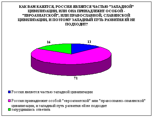 Согласно различным опросам, большинство населения РФ всё-таки, в конечном счёте, считает себя особой и самобытной цивилизацией. Вот результаты исследования, проведённого ВЦИОМ в ноябре 2001 года: по мнению 71% опрошенных россиян, Россия принадлежит особой - <евроазиатской>, или православной цивилизации, поэтому ей не подходит западный путь развития и только 13% считают Россию частью западной цивилизации[5].