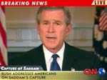 Правда, здорово? Правда, интересно? Молодцы, охотники-американцы. Убили огромное количество иракцев. Оккупировали и разворошили огромную страну. Захватили и держат в клетке законного президента Ирака, лезут ему в рот и бесцеремонно его осматривают, вертят, крутят, бесконечно показывая всё это по всему миру через все виды глобальных медиа. Апостолы гуманизма и человеколюбия, лидеры прогрессивного человечества, "они сделали это" и теперь бесконечно и всем показывают. Такие показы являются частью заранее разработанного PR-плана освещения данного события. Как сообщила New York Times за 15 декабря, специалисты тщательно отобрали кадры, которые должны показать Саддама Хусейна как сломленного, опустившегося человека. При этом американцы искренне радуются, шутят, улыбаются - т.е. САМИ ИСКРЕННО считают произошедшей своей выдающейся победой, вершинной точкой двухсотлетней истории. Вот главный автор агрессии Джордж Буш, самодовольный и счастливый, обращается к американцам с известием о пленении Саддама (Кадр CNN).