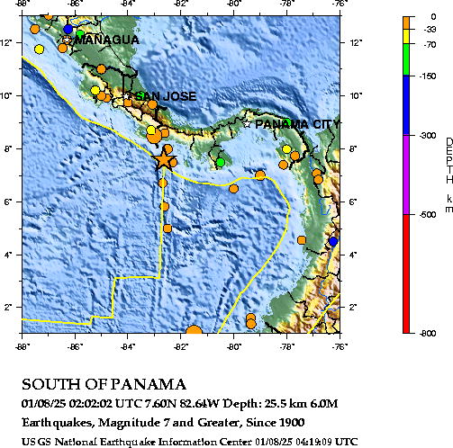 Землетрясение около побережья Панамы, вблизи точки тройного сочленения с магнитудой 6,2 Обычно подобные землетрясения пропускают службы новостей, поскольку они имеют невысокую магнитуду и если происходят не в близи от крупных городов, то не сопровождаются жертвами. Подобное землетрясение произошло недавно 25 августа в 4:19:09 по UTC в акватории Тихого океана в точке с координатами 7.60' с.ш. и 82,64' з.д. очаг располагался на глубине 25,5 км.