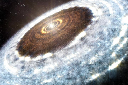 Астрофизики из Европейской южной обсерватории впервые наблюдали снеговую линию на орбите вокруг молодой звезды. Область, где вода, находящаяся в парообразном . . . |
