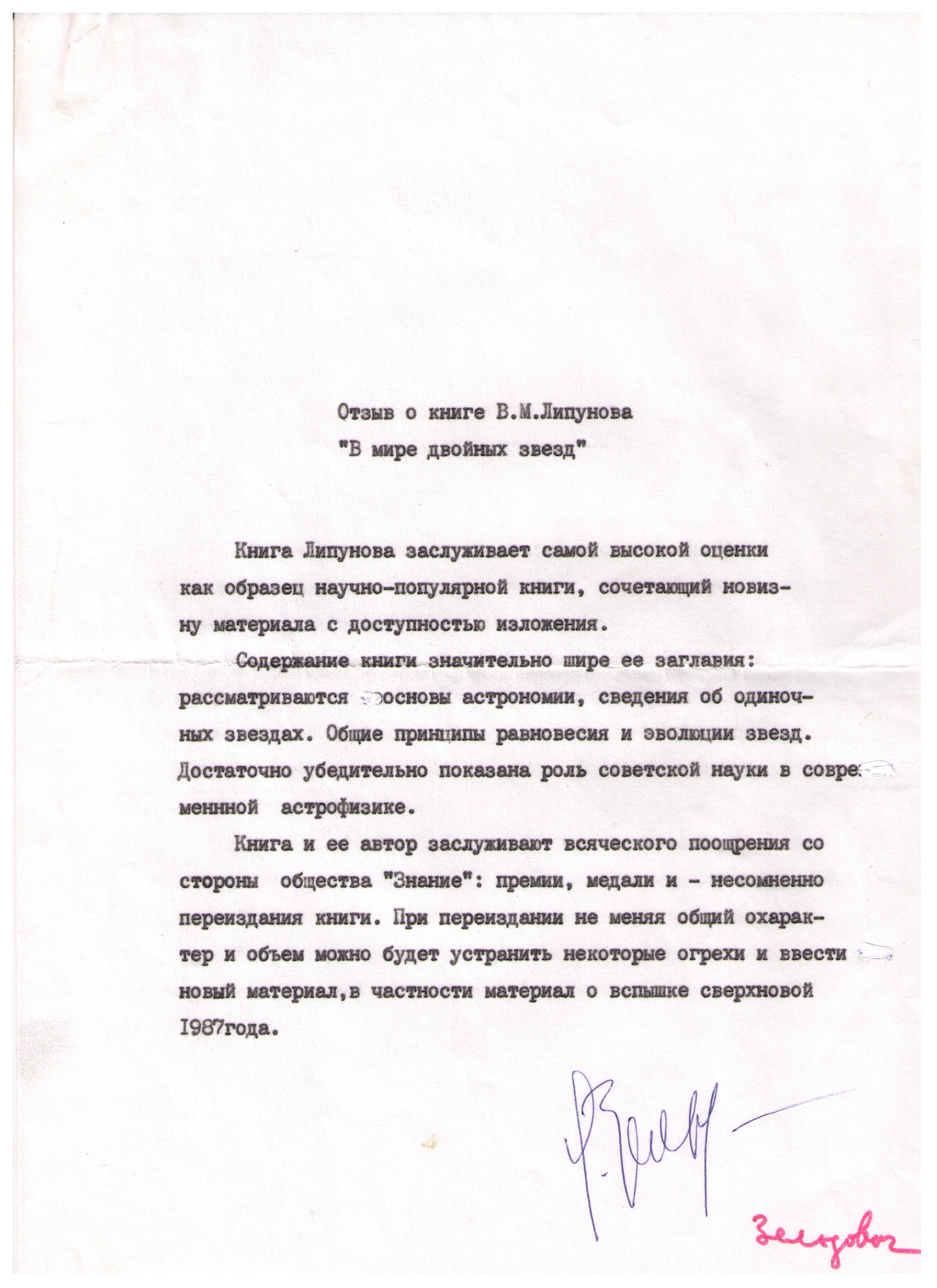 Очень дорог мне отзыв моего руководителя в аспирантуре - академика Я.Б.Зельдовича: