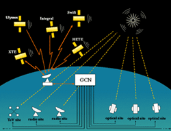 2). После обработки принятого гамма-излучения на борту, координаты всплеска направляются в Центр Международной сети изучения гамма-всплесков, расположенном на сайте НАСА (GCN).