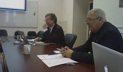 Директор НИЯФ МГУ Михаил Игоревич Панасюк (слева) - инициатор приглашения Джорджа Смута в Россию. Первое собрание Лаборатории Экстремальной Вселенной.