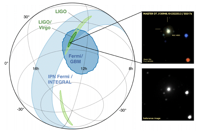область - окончательная локализация с привлечением данных ГВ-антенны Virgo. Справа показаны оптические