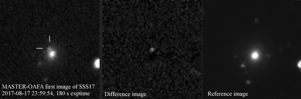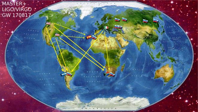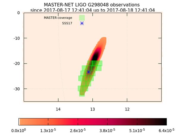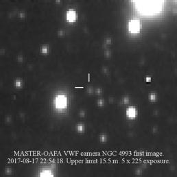 Первый снимок аргентинский МАСТЕР сделал в 22:54:18 UT то есть через 10.22 часа после столкновения и как выяснилось позже, телескопы МАСТЕРа прошли мимо галактики NGC 4993. Однако, наши широкопольные камеры с полем зрения 380 квадратных градусов накрыли почти весь квадрат ошибок вместе с местом столкновения нейтронных звезд.