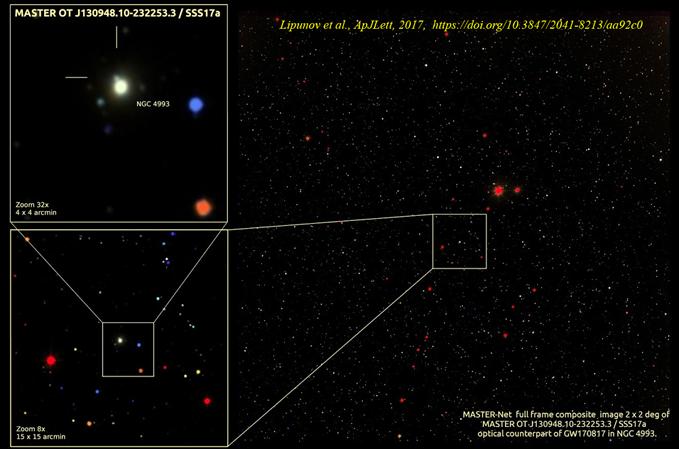 Ровно через час, за 6 секунд до исхода 17 августа 2017 по всемирному времени, телескопы МАСТЕР набрели на галактику, в которой случилось это историческое событие. Хороший подарок в день рождения МАСТЕРа.