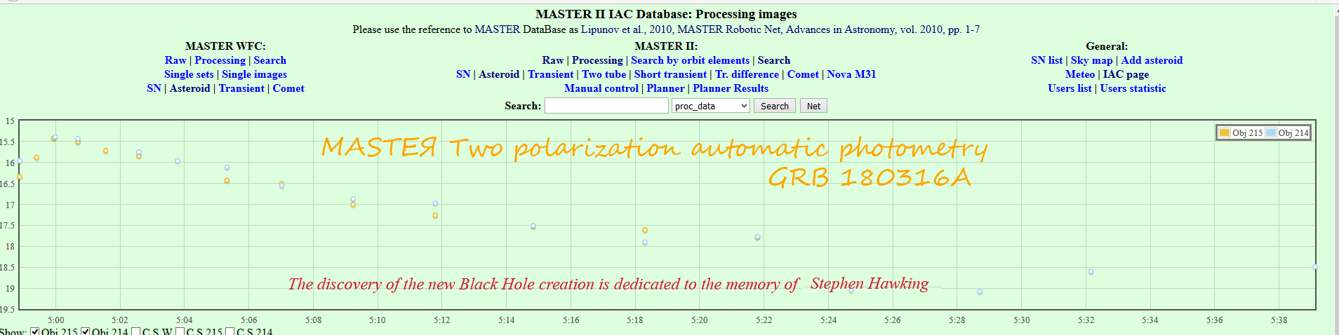 Только что закончились наблюдения. Телескоп-робот пошёл спать, а мы наоборот проснулись. Перед самым восходом на Тейде американская космическая обсерватория Свифт зарегистрировала образование черной дыры на другом конце Вселенной - гамма-всплеск. Робот МАСТЕР навёлся на гамма-всплеск через 15 секунд после получения координат и увидел самое начало и продолжение вспышки в видимом свете (в двух поляризациях!). Мастер опередил все другие телескопы мира и автоматически построил кривую блеска .Гамма-всплески - самые мощные источники электромагнитного излучения во Вселенной.