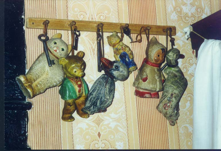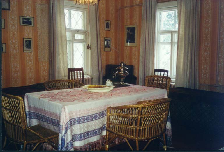 Есть в столовой несколько дорогих реликвий, связанных с имением Хрущево под Ельцом, где Пришвин родился: этюд 1913 года "Вид с веранды хрущевского дома" работы двоюродной сестры Пришвина М.Игнатовой, вышитая матерью Марией Ивановной Пришвиной дорожка с надписью "Чем более гляжу, тем более в тебе приятства нахожу" и старинная кофемолка.