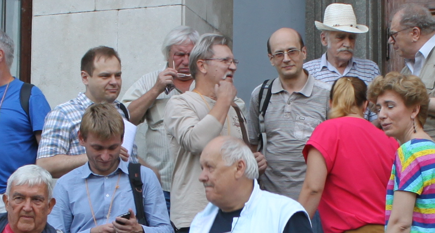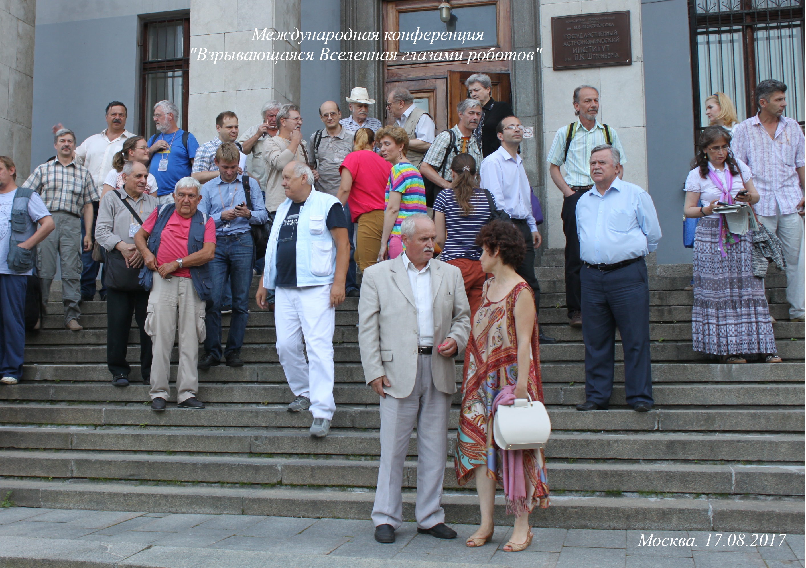 Этот динамичный момент групповой фотографии напоминает групповые портреты Рембрандта! В центре Сергей Симаков, что-то вдохноенно говорит окружающим: Сергею Назину, Татьяне Рагузовой, Алексею Богомазову... Вокруг слева направо: Франко Джиованнелли (Италия), Митя Свинкин (Петербург), Владимир Липунов, лицом к Сергею Юля Рабинович (ИРГУ, Иркутск). Вверху Александр Васильевич Тутуков (ИНАСАН) и Алексей Владимирович Бялко (Природа, Физпроблемы). 17 августа 2017 г. - день когда человечество впервые увидело место рождения гравитационных волн. Среди телескопов, которые участвовали в независимой локализации был и наш МАСТЕР-Аргентина. Москва. Ворбьёвы Горы, Астрономический институт МГУ. Конференция посвящённая юбилею МАСТЕРа. Все на этом форагменте ученики или друзья вашего непокорного слуги.