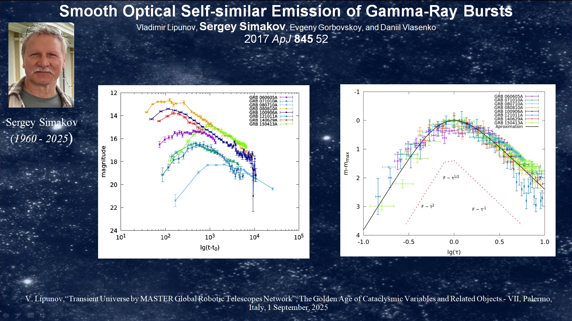 А когда сеть МАСТЕР вышла надругие континенты мы стали получать уникальные ркезультаты, которые требовали профессинального теоретического анализа и я пригласил Сергея поучаствовать в теоретическом обосновании нескольких интреснейших эспериментальных результатов - в основном наших. Здеь как и на конференции "Золотой век катаклизмических переменных" я помянул Сергея Симакова парой-тройкой слайдов и одним ярким результатом - открытием универсальной оптической формы кривой изменения блеска образующейся чёрной дыры. Да, наша система МАСТЕР получила примерно половину самых красивых наблюдательных данных за последние 30 лет по ранним наблюдениям самых мощных электромагнитных вспышек в нашей Вселенной - гамма-всплесков. Сергей быстро вошёл в тему и нашёл понятное объянение харатера кривой блеска, которую мы назвали SOS - излучением. В названии обызгрывается сигнал СОС который посылает нам гибнущая звезда, превращась в чёрную дыру. Это излучение подобно само себе - имеет автомоделный характер.