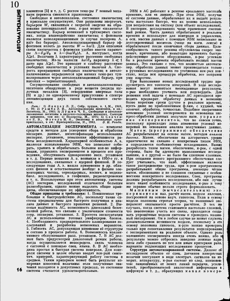 АВТОМАТИЗАЦИЯ ЭКСПЕРИМЕНТА ≈ комплекс средств и методов для ускорения сбора и обработки эксперим. данных, интенсификации использования эксперим. установок, повышения эффективности работы исследователей. Характерной особенностью А. э. является использование ЭВМ, что позволяет собирать, хранить и обрабатывать большое кол-во информации, управлять экспериментом в процессе его проведения, обслуживать одновременно неск, установок и т. д. Первые попытки А. э. возникли в 1950-е гг. в исследованиях, связанных с ядерной физикой. В последующие годы А. э. нашла применение в др. областях физики и естествознания вообще: в физике элементарных частиц, термоядерных, космич, и медико-биол. исследованиях, в геофизике, радиоастрономии и т. п. Используемые при этом автоматизир. системы (АС) эксперим. исследований отличаются большим разнообразием, однако можно выделить общие принципы, обеспечивающие их эффективность.